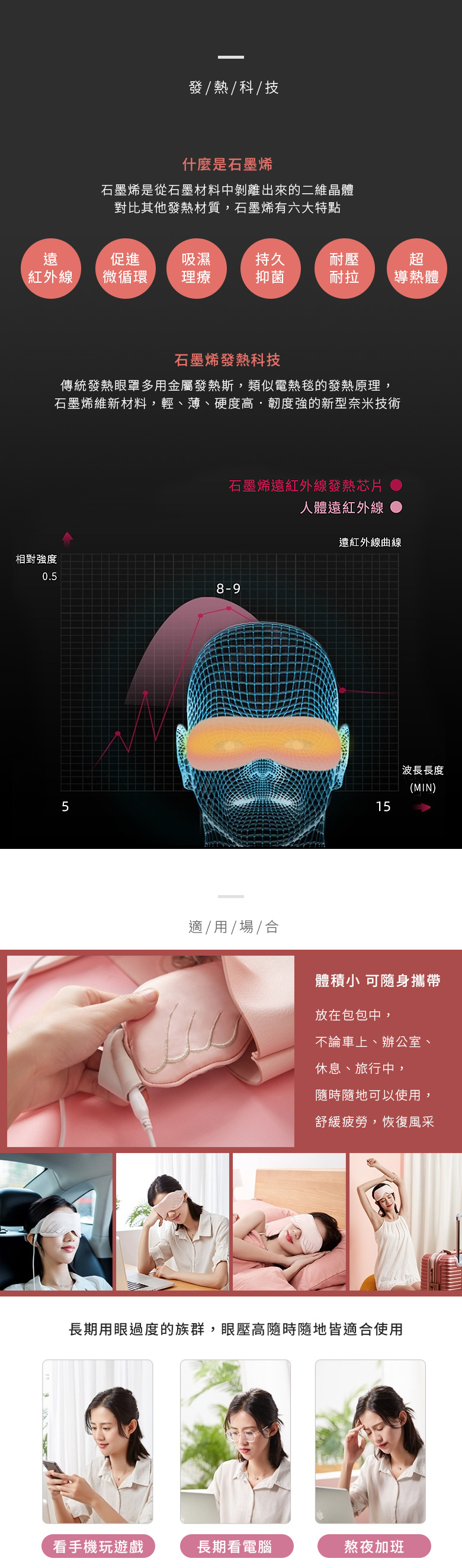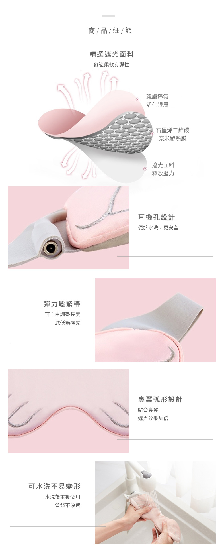 | 詳細說明 | 挑選親膚材質,舒適遮光,不壓眼,不壓鼻搭配石墨烯助眠溫控系統,依循人體睡眠生理的溫度變化來制定溫控系統幫助入睡,享受高質量的睡眠。 |