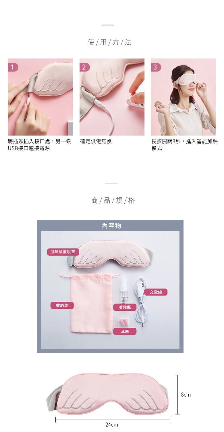 | 內容物 | 眼罩*1、收納袋*1、噴霧瓶*1、耳塞*1、充電線*1 |